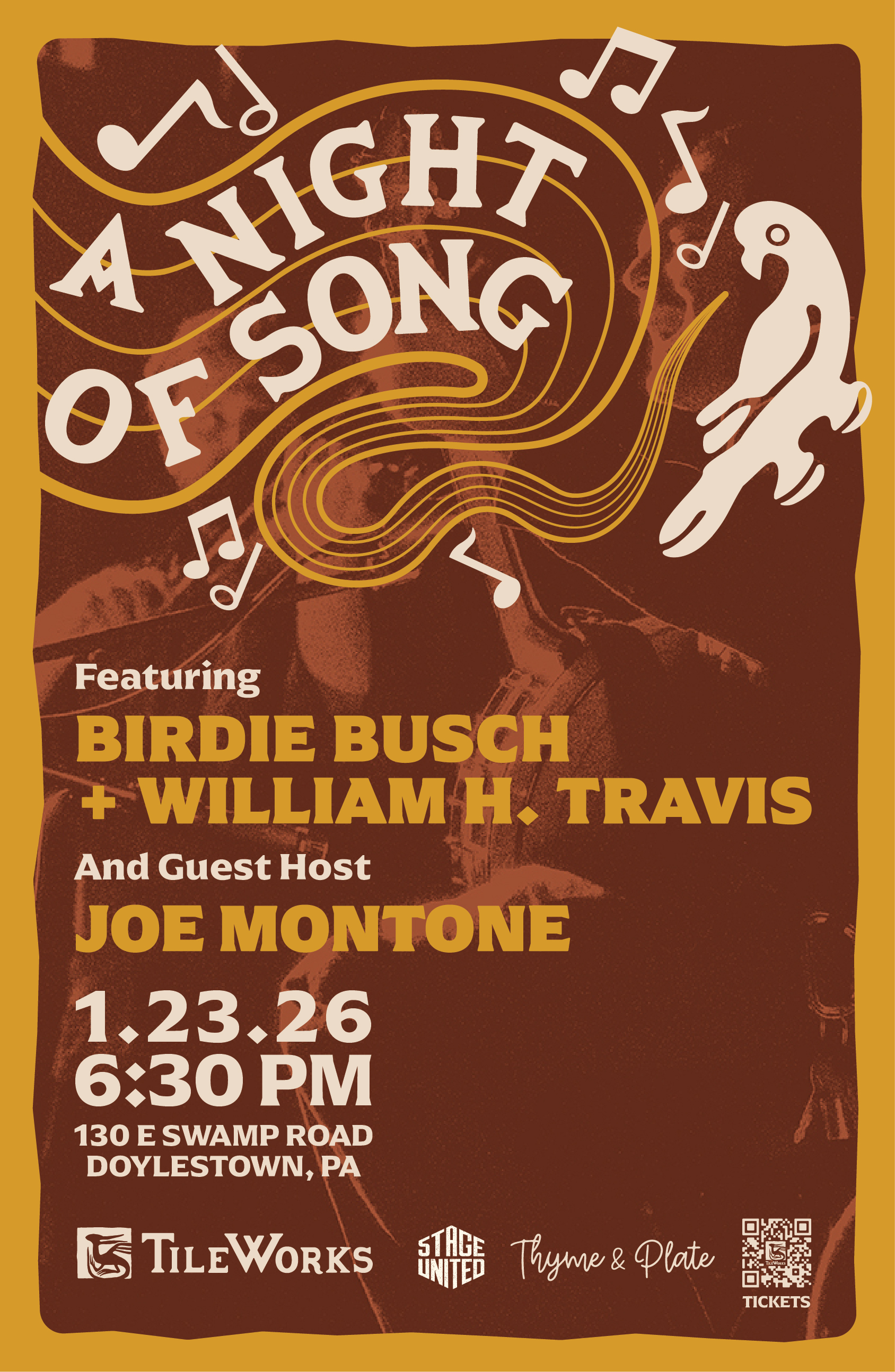 FORMStage United + TileWorks presents A Night Of Song inside The Big Room at The TileWorks. This is a celebration of powerful, hand crafted songs from artists near + far. On 1.23.25, enjoy the songs and stories of BIRDIE BUSCH + WILLIAM H. TRAVIS with special guest host, Joe Montone. DOORS: 6:30PM. Chef Dan Gallo of Thyme & Plate Catering will be on-site with delicious snacks.
